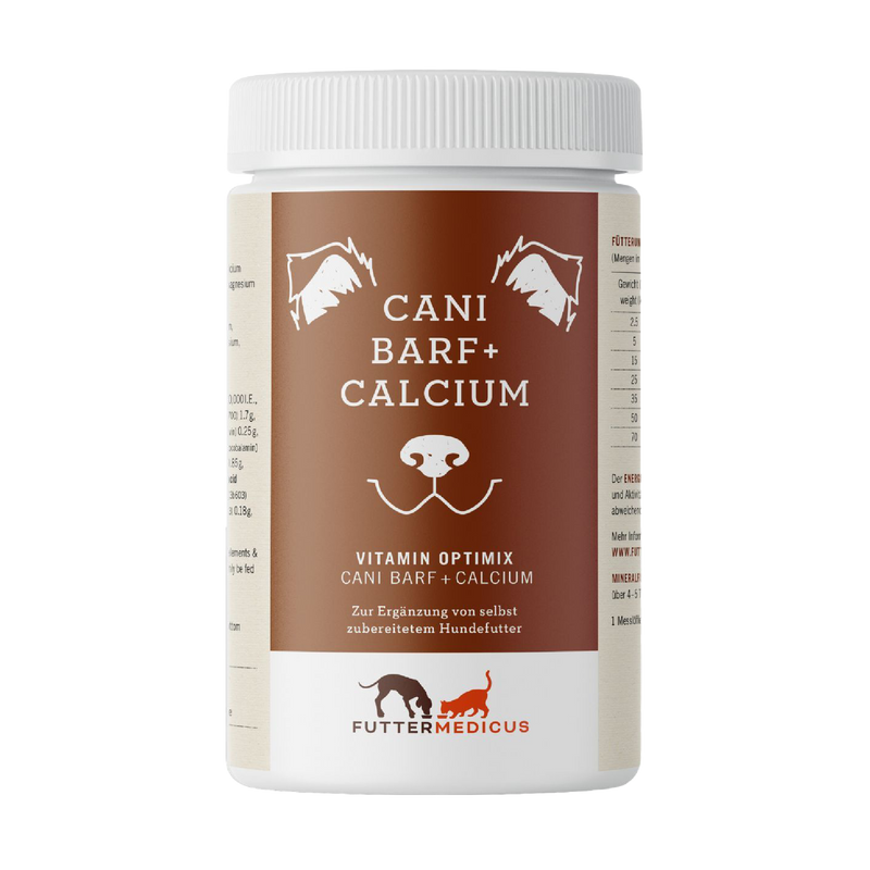 The Futtermedicus nutrition team develops tailored supplements for cat and dog nutrition. The Vitamin and Mineral Supplement Vitamin Optimix Cani BARF (Raw) plus Calcium is highly concentrated and easy to mix into food as a fine powder.